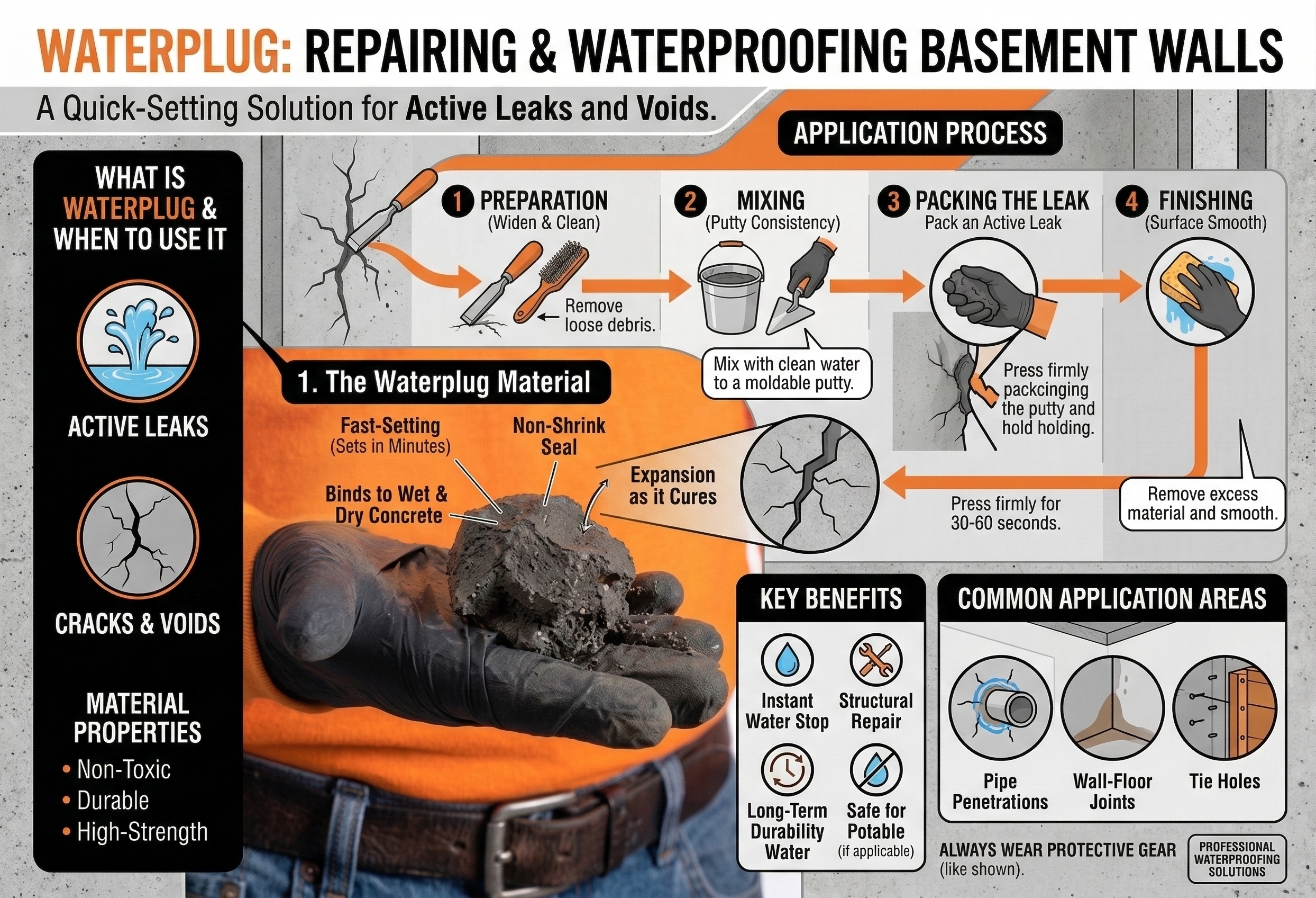 Waterplug hydraulic cement is a one-component, quick-setting, Portland-cement-based hydraulic repair mortar that instantly stops running water through holes or cracks in concrete or masonry. See data sheet for mixing and application details.
